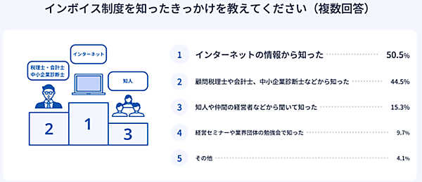 「知っている」と回答した484人に「インボイス制度を知ったきっかけ」を聞くと、「インターネットの情報から知った」50.5%が最多で、「顧問税理士や会計士、中小企業診断士などから知った」44.5%、「知人や仲間の経営者などから聞いて知った」15.3%がそれに続く。