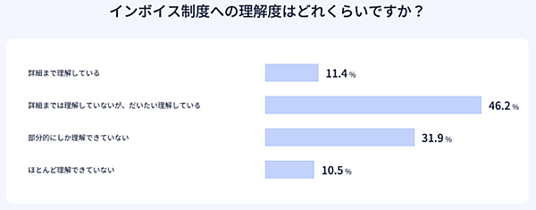 さらに「インボイス制度を理解しているか」を聞くと、「部分的にしか理解できていない」31.9%、「ほとんど理解できていない」10.5%となり、4割超が理解できていない。導入後の混乱が予測される。