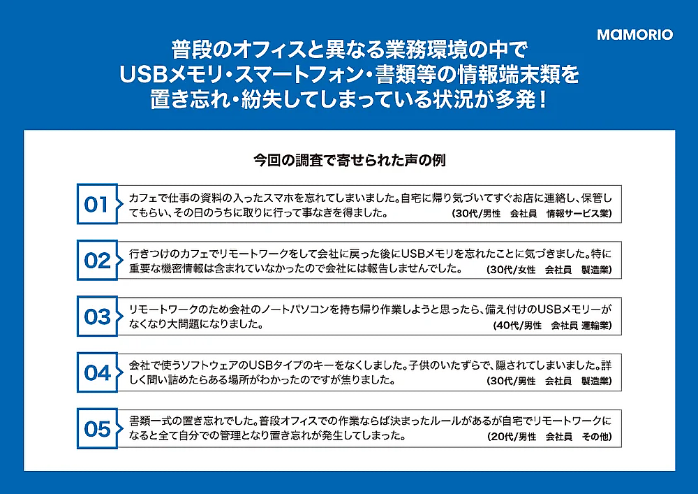 リモートワーク中の置き忘れや紛失事故の詳細についてアンケートを取ると、コワーキングスペースやネットカフェやホテルなど、オフィス外での業務の際に、情報の入ったUSBメモリやスマートフォン、書類などの置き忘れ・紛失が多発していることが判明した。
