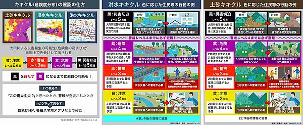 キキクルのインフォグラフィックは、土砂、浸水、洪水の危険度について「注意(レベル2相当)」「警戒(レベル3相当)」「危険(レベル4相当)」「災害切迫(レベル5相当)」を黄、赤、紫、黒で色分けして地図上に表示。色に応じた行動の例をイラストで紹介する。インフォグラフィックは「Yahoo! JAPAN」の各サービスや気象庁のSNS、講演会などでの利用を予定している。