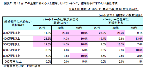 なお同社が2022年4月に実施した「第1回 離婚したくなる夫・妻の仕事」の調査結果では、年収400万円~600万円の層であっても、各世代でパートナーの給与に不満を抱えているという。