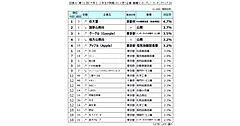 以下4位「グーグル(Google)」(6.9%、前年6位)、5位「パナソニック」(6.8%、前年7位)、6位「アップル(Apple)」(6.6%、前年5位)、7位「ソニー」(6.4%、前年8位)、8位「任天堂」(5.5%、前年4位)、9位「サントリー」(5.4%、前年14位)、10位「伊藤忠商事」(4.4%、前年17位)と、細かく順位が変動している。