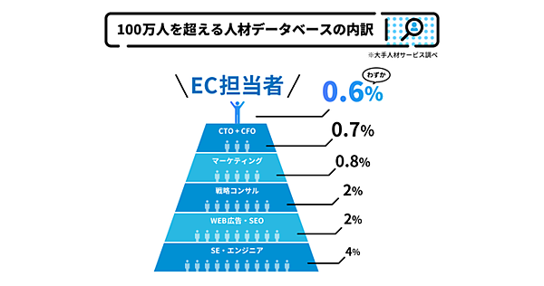 カートシステムの充実でEC事業の立ち上げが容易になったが売上アップの難易度は高い。登録者100万人超の転職データベースでもEC担当者は0.6%相当しかおらず、新たな採用は難しいの現状だった。WUUZYは、人材・ノウハウ不足で悩むEC事業主にECプロ人材をマッチングさせ、事業成長や売上拡大に貢献していく。