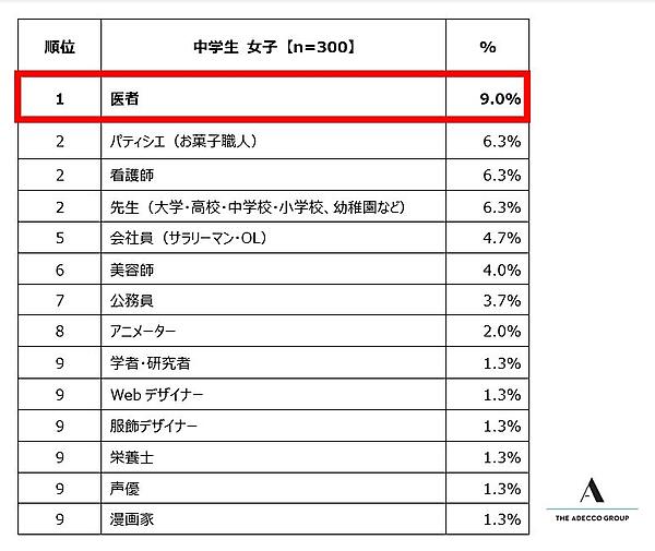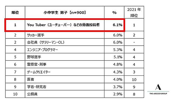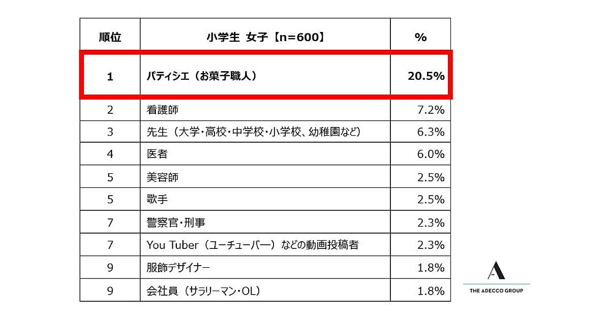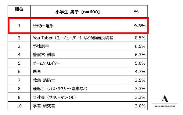 Adecco Group Japan(アデコ)は、「将来就きたい仕事」に関する調査結果を発表した。日本全国の小中学生が対象で1,800人(男子900人・女子900人)から回答を得ている。毎年実施しており今回で8回目。
