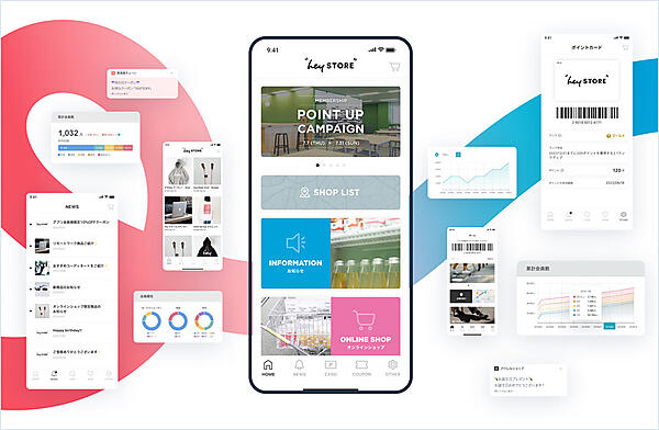 実店舗とネットショップの来店・購買行動を顧客ごとに紐づける。アプリ上のアンケート配信で好みを取得して、その人だけに向けた「1to1」のメッセージやクーポン特典を自動配信する。アプリ認証方法は、ICタッチやレシート印字、QRコードなど豊富に用意したしている。管理画面で新規/リピーター比率や、会員属性、来店周期を分析できる。