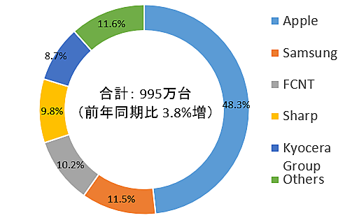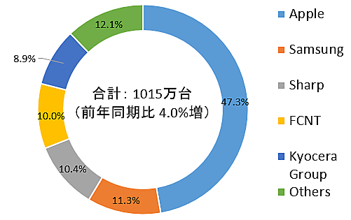 1,015万台の内訳は、スマートフォンが995万台、その他フィーチャーフォンなどが20万台。ベンダー別で見ると、アップルが47.3%(前年同期比1.0%増)で引き続きトップシェアだった。以下、サムスン、シャープ、FCNT(旧富士通コネクテッドテクノロジーズ)などが10%台で並ぶ。スマホに限定すると、FCNTが4位から3位に浮上しシャープと入れ替わった。