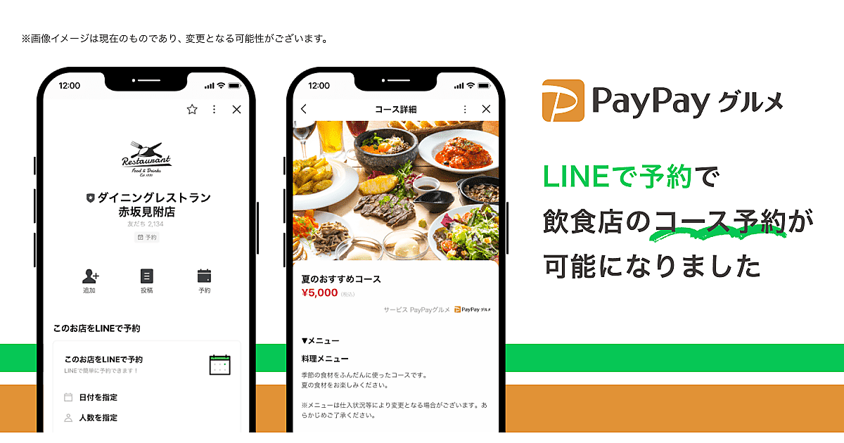 ヤフーは、同社が運営する飲食店予約サービス「PayPayグルメ」で、LINEとの連携を強めた、と7月12日発表した。LINEのコミュニケーションアプリ「LINE」上で飲食店の予約ができるサービス「LINEで予約」経由での飲食店のコース予約を可能にした。PayPayグルメとLINEで予約の連携は、これまで「席のみ予約」だったが、コースの選択・予約に拡大した。