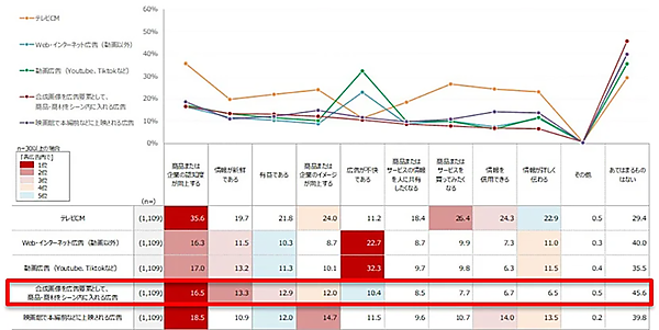 まず、「テレビCM」「Web・インターネット広告(動画以外)」「動画広告(YouTube、TikTokなど)」「合成画像を広告要素として商品・商材をシーン内に入れる広告(以下、プロダクトプレイスメント)」「映画館などで本編前などに上映される広告」の5つの広告について、それぞれに対して視聴者が持っている印象を調査した。