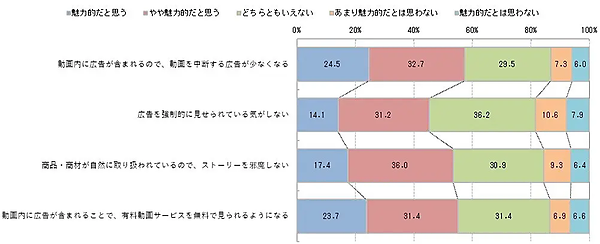 「魅力的」だとする内訳として、「動画内に広告が含まれるので、動画を中断する広告が少なくなる(24.5%)」「動画内に広告が含まれることで、有料動画サービスを無料で見られるようになる(23.7%)」「商品・商材が自然に取り扱われているので、ストーリーを邪魔しない(17.4%)」「広告を強制的に見せられている気がしない(14.1%)」と回答している。