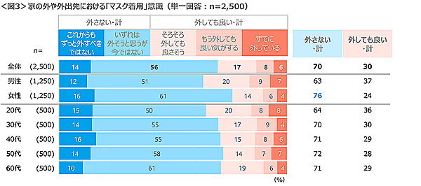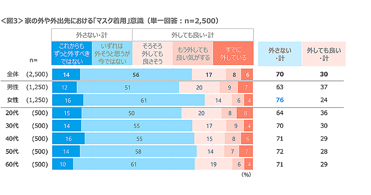 そこで「マスク着用に対する意識」を聞くと、「いずれは外そうと思うが今ではない」56%が圧倒的多数派だった。「これからも外すべきではない」14%と合わせると、7割に達する。
