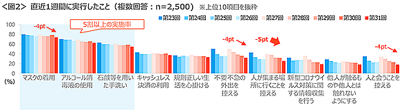 「直近1週間に実施した感染対策」では「マスクの着用」74%、「アルコール消毒液の使用」63%、「石けんなどを用いた手洗い」56%となり、多くが基本的な感染対策をいまだ継続していることがうかがえる。