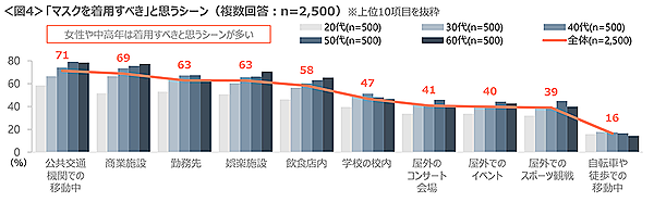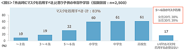 「マスクを着用すべきシーン」「マスクを着用すべきと思う子どもの年齢」などを聞いても、「公共交通機関での移動中」「商業施設」、あるいは「小学生以上」など、強い抑制傾向がみられる。特に女性20代・30代は未就学児の「5~6歳」もマスクを着用すべきとの意見が多かった。