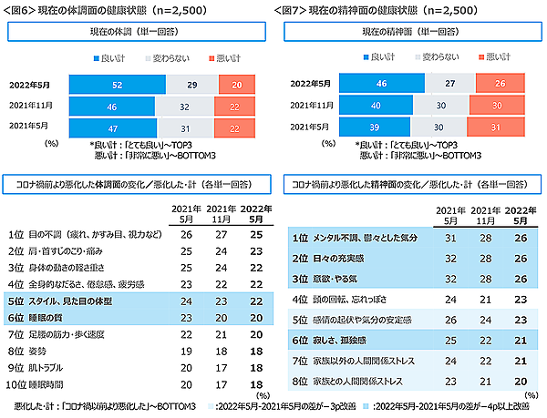 コロナ禍により体調が悪化したという人は実は少数派で、現状「良い」52%、「変わらない」29%、「悪い」20%となっている。悪くなったという人は、「目の不調」「肩・首すじのこり・痛み」「身体の動きの軽さ重さ」を訴えているが、前回調査などと比較すると改善傾向が見られる。