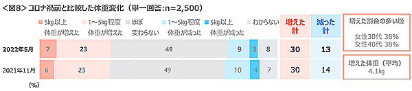 なおコロナ禍で「体重が増えた」という人は3割ほどで、増えた体重は平均4kgだった。
