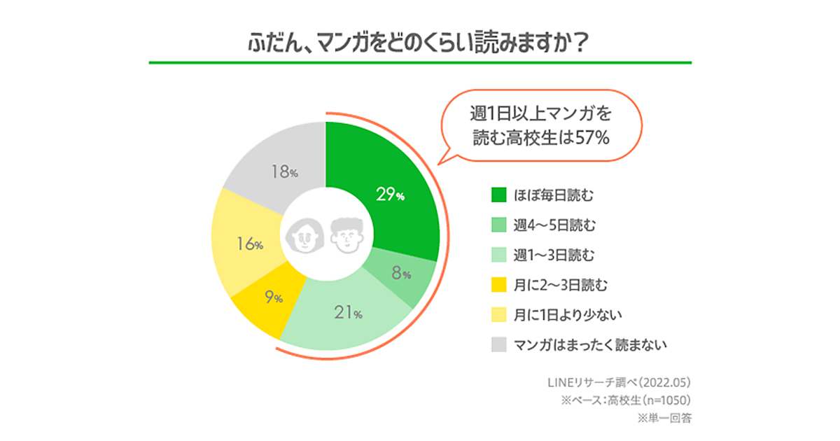まず「ふだんどのくらいマンガを読んでいるか」(マンガ・コミック・マンガ雑誌など、紙の本、電子書籍すべて含む)を聞くと、「ほぼ毎日読む」は29%。これを含んで「週1日以上」マンガを読んでいた高校生は57%だった。一方「マンガはまったく読まない」という人も18%存在した。これは前年2021年の調査とほぼ同じ割合だった。