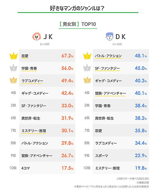 「好きなマンガジャンル」を聞くと、女子高校生(JK)トップ3は「恋愛」「学園・青春」「ラブコメディ」、男子高校生(DK)トップ3は「バトル・アクション」「SFファンタジー」「ギャグ・コメディ」と明確に違いが現れた。全体平均では「恋愛」が最も高い割合を占めたという。