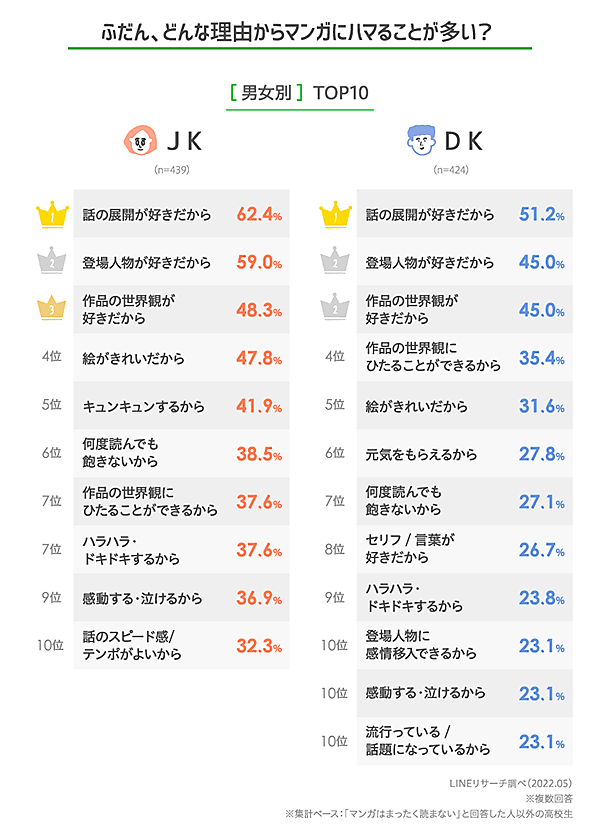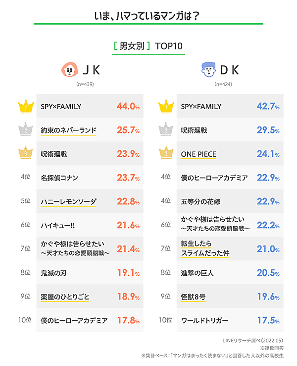 DKでは2位『呪術廻戦』に続き、マストとも言える『ONE PIECE』(作:尾田栄一郎)が3位にランクインした。その他では、僅差で『僕のヒーローアカデミア』(作:堀越耕平)、『五等分の花嫁』(作:春場ねぎ)、『かぐや様は告らせたい ~天才たちの恋愛頭脳戦~』(作:赤坂アカ)が続いた。その他『転生したらスライムだった件』『怪獣8号』などが、JKではトップ10外だが、JDではランクインしている。