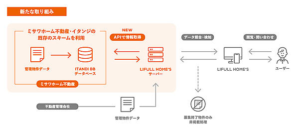 ITANDI BBからミサワホーム不動産が管理する物件情報をAPIで取得し、募集が終了した物件をLIFULL HOME'S掲載の物件情報と照合して自動で非掲載にする仕組みを導入した。情報精度の向上には、管理会社の物件情報とLIFULL HOME'Sのデータベースの照合回数を増やす必要があるが、LIFULL側から管理物件情報をAPIで取得するので、管理会社側が情報入稿する負担を増やすことなく掲載終了物件を取り下げることができる。