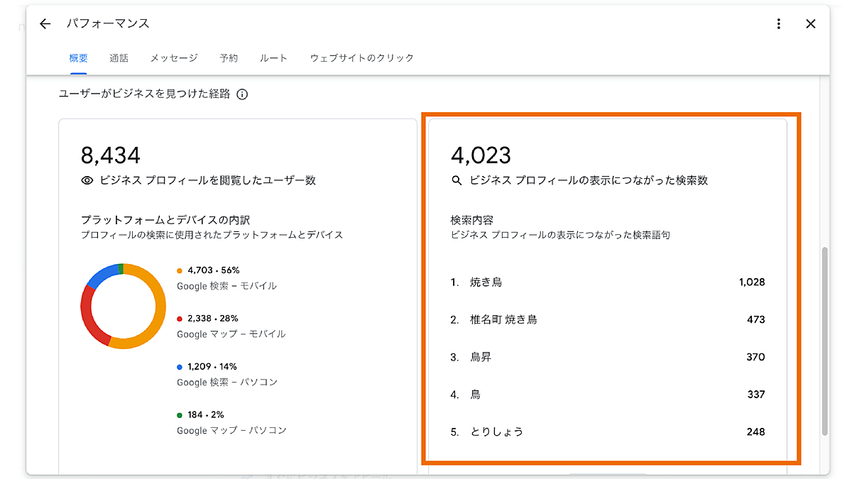 ビジネスプロフィールの表示につながった検索数とは、「Google検索/Googleマップ」で実際に検索され、表示されたキーワードのリストと検索数を月次集計したもの。店舗がどんなキーワードでどのくらいの数を検索されたのかが把握できるので、自店舗の検索ニーズの高いキーワードや、そのキーワードで自店舗が表示されるよう最適化されているかを確認できる。自店舗の現状把握や施策の検討で非常に重要なデータとなっている。