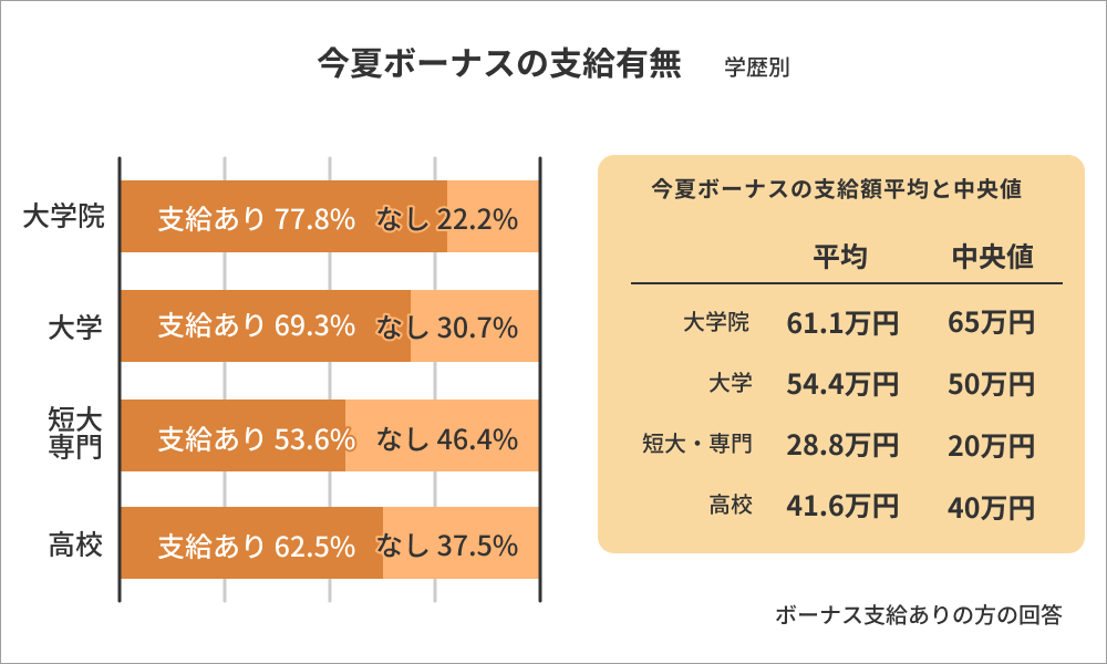 学歴ごとに見ると、支給ありの最多は「大学院卒」77.8%、最少は「短大・専門卒」53.6%だった。額面についても「大学院卒」61.1万円が最も高く、「短大・専門卒」28.8万円が最も低い。