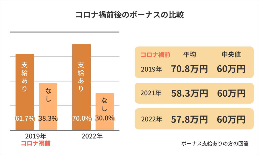 続いて、「コロナ禍の前と後」で比較すると、「夏ボーナスの支給はあるか」について2019年夏は「あり」61.7%だったが、今回(2022年夏)は「あり」70.0%で、かなり上昇している。一方で支給額については、2019年夏平均が「70.8万円」だったのに対して、今回は「57.8万円」に留まっている。