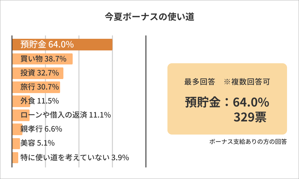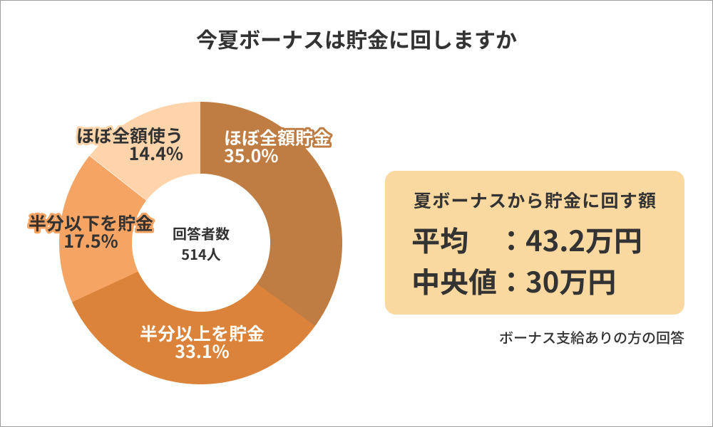 さらに「今夏ボーナスの使い道」ついて聞くと、「預貯金」64.0%が最多で、「買い物」38.7%、「投資」32.7%に大きく差を付けている。今夏はリベンジ消費が期待されていたが、まだ時期尚早のようだ。また「ボーナス全額のうち貯金に回す額」については、「ほぼ全額貯金」35.0%、「半分以上を貯金」33.1%で、多くが貯金を予定しており、平均43.2万円(中央値30万円)となっている。