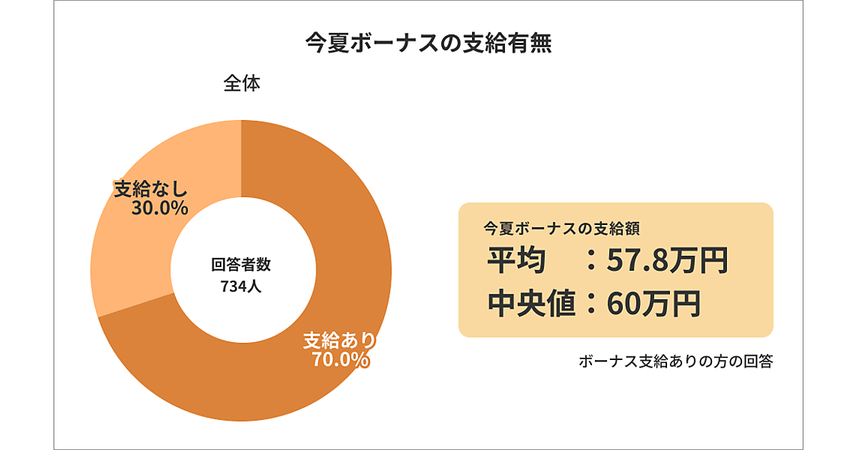 まず「今夏ボーナスの支給有無」を聞くと、「支給あり」は70.0%で、支給額平均は「57.8万円」、中央値は「60万円」だった。