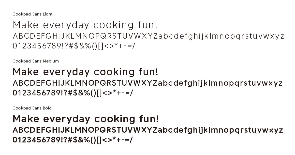 新フォントのCookpad Sansは、クックパッドのロゴタイプフェイスを起点とした欧文フォント。デジタルフォントの企画・開発・販売のフォントワークスが作成した。新デザインとフォントで一貫したコーポレートブランディングとコミュニケーションを図る。