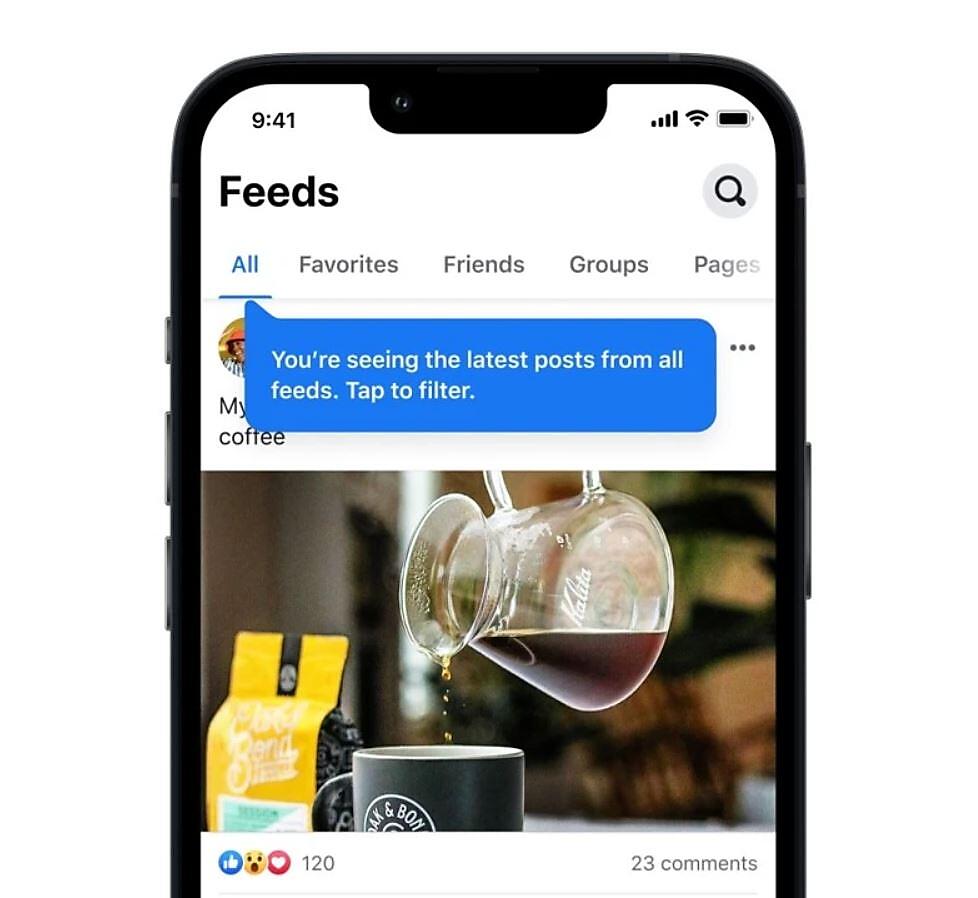 Facebookアプリを開いて最初に表示され、新しいコンテンツを見つけるタブに「ホーム」と新たに名付けた。ホームから「リール」や「ストーリーズ」にアクセスして、つながりやコンテンツを楽しみ、発見する際の起点となる。一方、フィードは、友達、お気に入り、ページ、グループの最新の投稿を見つけ、気になる友達やページをまとめたお気に入りリストを作成できる。フィードにおすすめは表示されないが、広告は表示される。