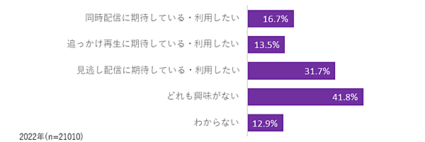 2022年4月から「TVer」にて地上波放送の同時配信・追っかけ再生の提供が始まった。また以前から行われている見逃し配信を利用するユーザーも多い。こうした「地上波放送のネット配信」への期待(利用意向)を聞くと、「同時配信に期待している・利用したい」16.7%、「追っかけ再生に期待している・利用したい」13.5%、「見逃し配信に期待している・利用したい」31.7%だった。同時配信、追っかけ再生、見逃し配信のいずれかの意向をもつユーザーは、複数回答での重複を削除しても合計45.3%にまで達している。