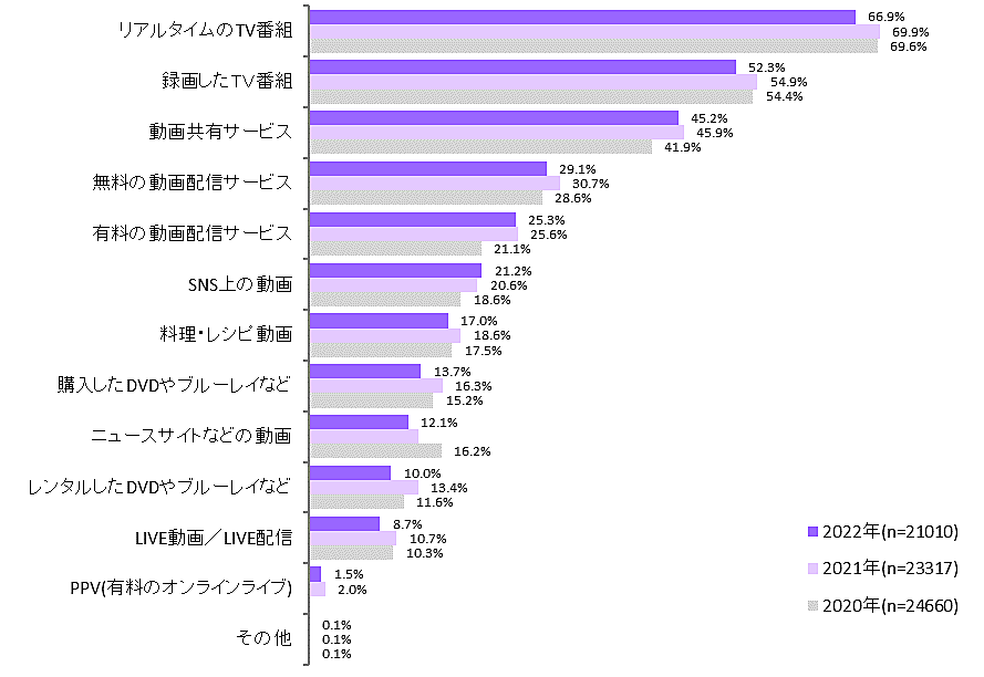 - 【有効回答数】1,913人(有料動画配信サービス利用者1,322回答、無料動画配信サービスをよく視聴する利用者945回答、動画共有サービスをよく視聴する利用者1,246回答)