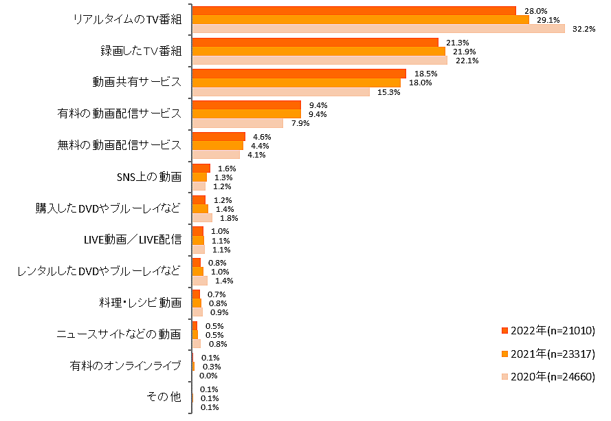 「ふだんよく視聴する映像・動画の種類」では、コロナ禍の落ち着きなどもあり全サービスが軒並み前年より下がったが、特にTV番組が落ち込んでいる。「リアルタイムのTV番組」66.9%、「録画したTV番組」52.3%が、「動画共有サービス」45.2%を大きく上回っており、まだまだ動画の中心ではあるが、徐々に差を詰められている形だ。