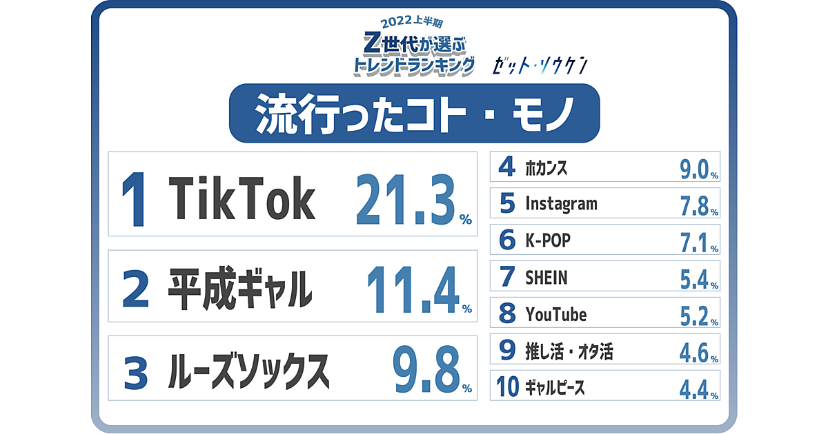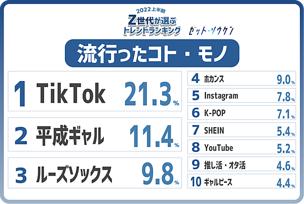 流行ったコト・モノでは、「TikTok」21.3%が1位だったが、2位に「平成ギャル」11.4%、3位に「ルーズソックス」9.8%が突然のランクイン。令和も4年目になり、なぜかいま平成ギャルが復権を見せている。アニメ『パリピ孔明』が放送中だが、そこでも平成のJ-POPが多数使われており、平成リターンズな状況だ。