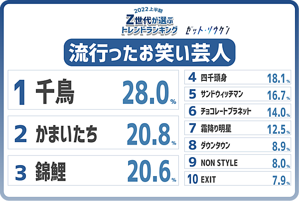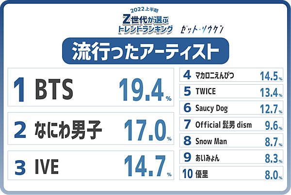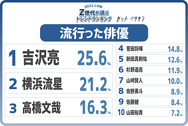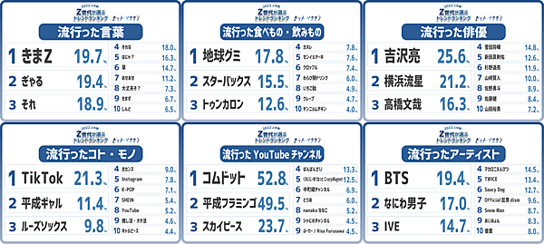 俳優では、男性陣がトップ10すべてを占め「吉沢亮」が「横浜流星」「高橋文哉」をおさえ1位となった。お笑い芸人では「千鳥」が、アーティストでは「BTS」が1位となった。アーティスト3位に韓国の女性アイドルグループ「IVE」が入ったほか、食べ物で「トゥンカロン」や「センイルケーキ」、「ヤンニョムチキン」がランクインするなどZ世代の韓流人気はまだまだ衰えていない。