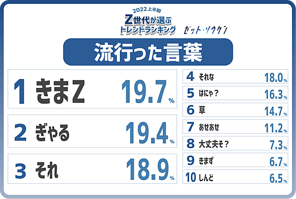 流行した言葉(フレーズ)は、半年前の調査では3位だった「きまZ」が1位だった。YouTubeチャンネル『ウチら3姉妹』から広まったワードだ。そして2位には「ぎゃる」がいきなりのランクイン。楽曲『GAL(feat. Shake Pepper & Yvngboi P)』がTikTokで流行したためだが、ワードとしても流行っている模様だ。上位は短文の返答のようなワードが並んでいる。