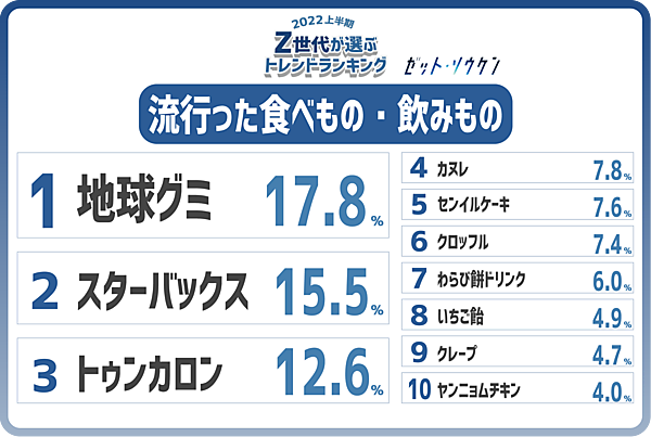 食べ物・飲物では、サムネ映え・動画映えする「地球グミ」が引き続き人気でトップとなった。その他も定番のワードが上位を占めた。