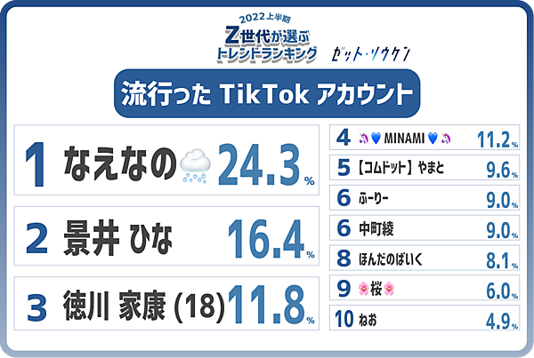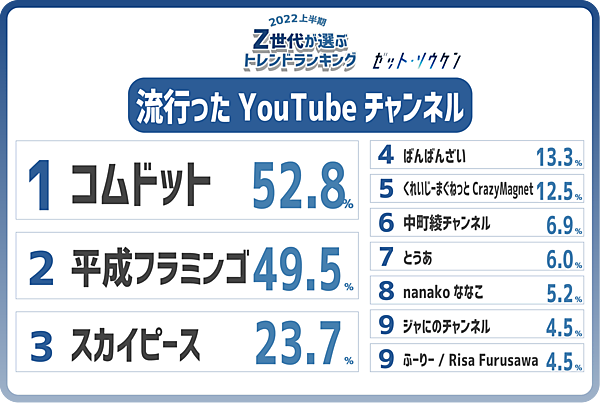流行ったYouTubeチャンネルでは、「コムドット」52.8%と「平成フラミンゴ」49.5%が強さを見せた。流行ったTikTokアカウントでは「なえなの」24.3%も安定して人気だ。TV番組やCMへの進出もあり、一般知名度も着実に上昇しZ世代の局所的人気から抜け出た感もある。