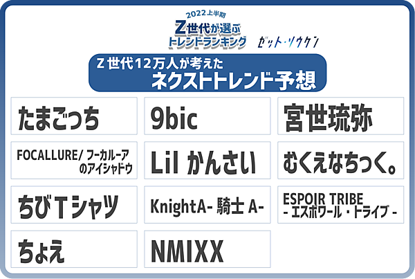 最後に、「ネクストトレンド予想」を広く聞くと、「たまごっち」「9bic」「NMIXX」「ちびTシャツ」などの名前があがった。