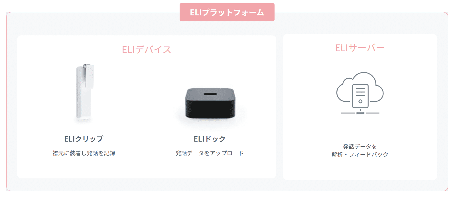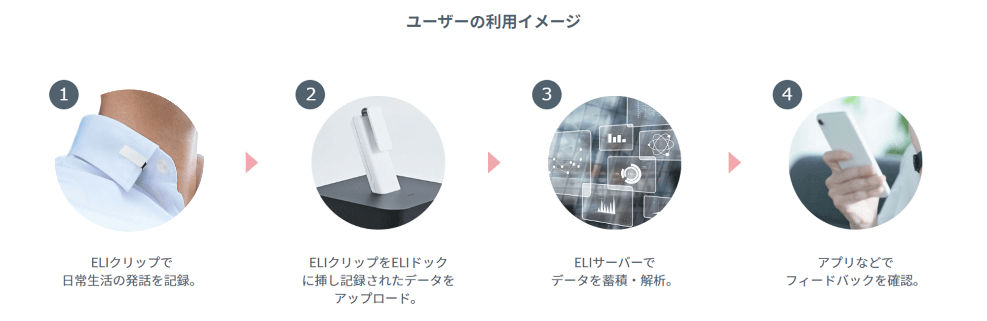 ELIは自分の会話を解析して最適な英会話を学ぶ機器。声のトーンには感情やストレスの度合いなどの情報が含まれる。自然言語処理や音声解析技術の向上で発話データが注目され、オンラインのデータ解析サービスが普及する一方、現実の場での発話データは環境音による認識精度の低下やデータ分析に手間がかかることから、活用が進んでいなかった。