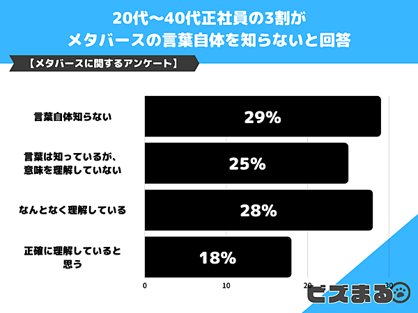 20代~40代正社員300人に、「メタバース」を知っているか、またその意味を知っているかを聞くと、「言葉自体知らない」29%、「言葉は知っているが、意味を理解していない」25%、「なんとなく理解している」28%、「正確に理解していると思う」18%となった。