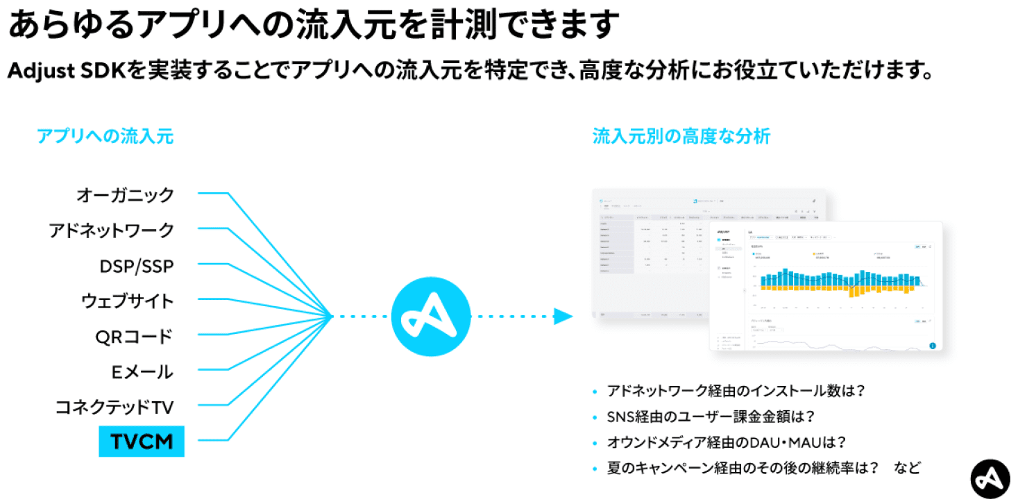 Adjustの管理画面では広告媒体、オウンドメディア、ORコード、電子メール、コネクテッドテレビなど流入元ごとのインストール数、起動数、収益イベント数などが分かり、テレビCMに関しては地区、番組名、クリエイティブが表示される。テレビ広告がインストールの契機になったユーザーのその後の行動を把握し、キャンペーンの最適化につなげられる。
