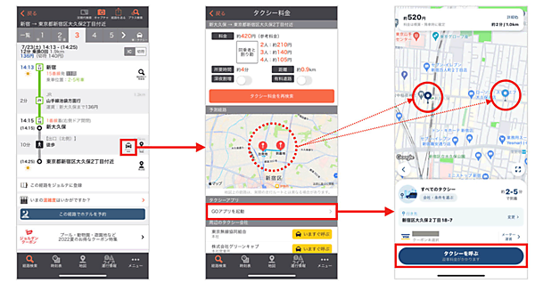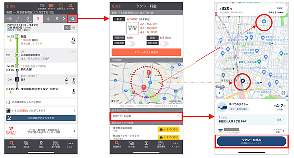 乗換案内アプリの経路検索がGOのサービスエリア内なら、検索した全区間や一部徒歩ルート区間として表示されたタクシー利用経路をクリックすると、乗車地と降車地が反映された形でGOが開いてタクシー配車が可能。マルチモーダル検索の経路案内で、移動手段の予約・決済までを1クリックで切れ目なく提供・完結できるサービス形態を目指す。