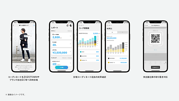 成果確認機能は、投稿コーディネート経由のEC売上や閲覧数などの成果を可視化。ショップスタッフのオンライン上での活躍を適切な評価につなげる。既に「アダストリア」、「パル」、「ラコステジャパン」など複数のブランドに新機能の提供しており、提供先は順次拡大する。コーディネート投稿機能と成果確認機能は、今秋から可能になるブランド自社ECへのコーディネート投稿を含めて無料で提供する。