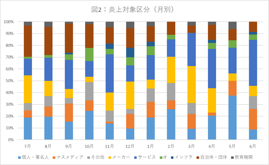 月次の炎上件数を見ると、3月はメーカー、4月と6月はサービス業、5月は個人・著名人に関する炎上が上位を占めている。なお同時期に起きた事件としては以下のようなものがある。