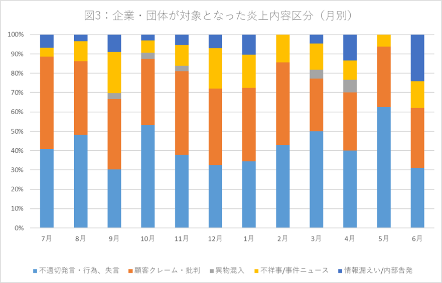 さらに「炎上の火種となる行動」について見ると、「不適切発言・行為、失言」が最も多く、次いで「顧客クレーム・批判」が続く。この2つを合わせるとほぼ全体の8割を占めている。なお月次推移を見ると、兵庫県尼崎市のUSBメモリ紛失に関連して、6月は「情報漏えい/内部告発」の占める割合が増加していた。