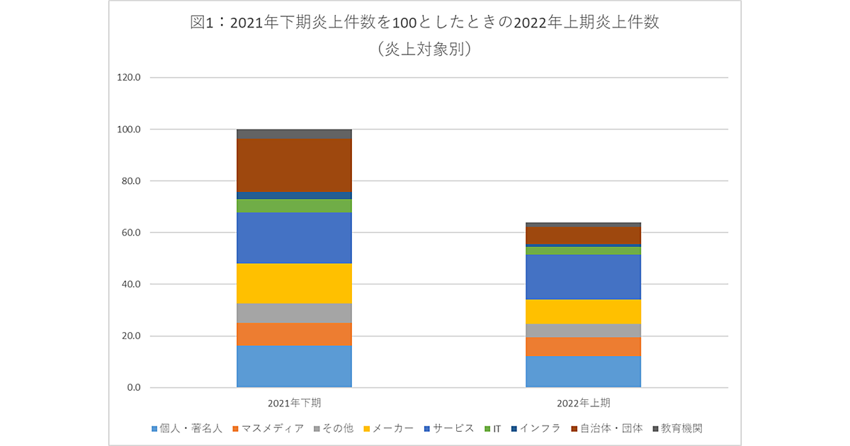 2021年下期(2021年7月~12月)を100として比較すると、2022年上期(2022年1月~6月)のネット炎上件数は、36%減少した。カテゴリ別で見ると、「自治体・団体」に関する炎上が前期から半分以上減少している。これは前期においてはオリンピック・パラリンピック関連の炎上が多発しており、その反動と考えられる。