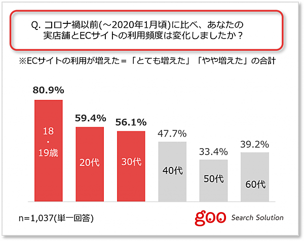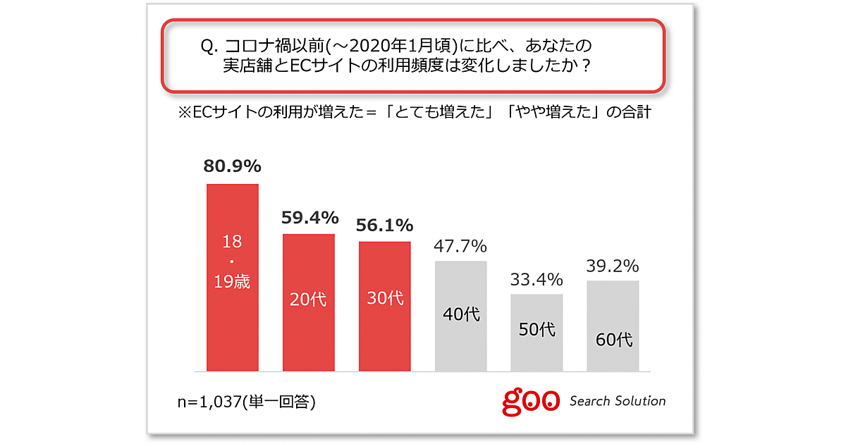 NTTレゾナント(goo)は、「コロナ禍におけるECサイトの利用動向」に関する調査結果を発表した。1か月以内にECサイトを使用した1,037人が回答している。