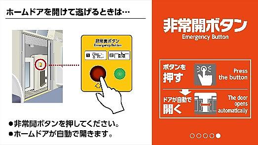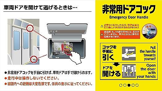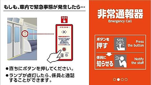 「もしも、車内で緊急事態が発生したら…」(非常通報器)▽「車両ドアを開けて逃げるときは…」(非常用ドアコック)▽「ホームドアを開けて逃げるときは…」(駅ホームドアの非常開ボタン)--のように状況ごとに説明する。今後は同ガイドラインに基づき、全車両を対象にピクトグラムを活用した表示の共通化も進める。