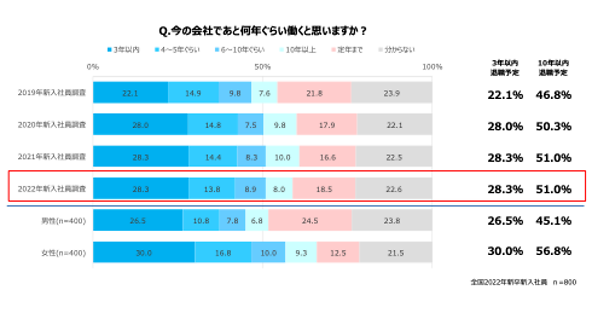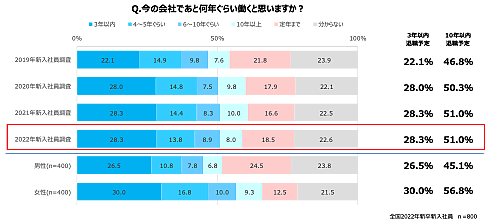 まず「今の会社で何年ぐらい働くと思いますか」と聞くと、「3年以内」が28.3%、「10年以内」が51.0%だった。この数値はいずれもここ数年、徐々に増加している。