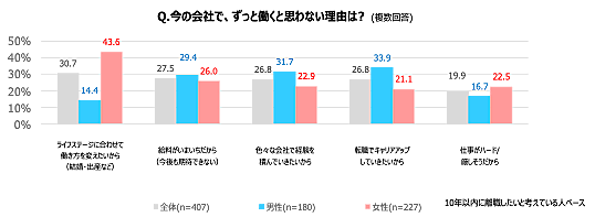 「今の会社でずっと働き続けないと思う理由」を聞くと、男性の上位は「転職でキャリアアップしていきたいから」33.9%、「いろいろな会社で経験を積んでいきたいから」31.7%、「給料がいまいちだから」29.4%、女性の上位は「ライフステージに合わせて働き方を変えたいから」43.6%、「給料がいまいちだから」26.0%、「いろいろな会社で経験を積んでいきたいから」22.9%と、男女差が見られた。